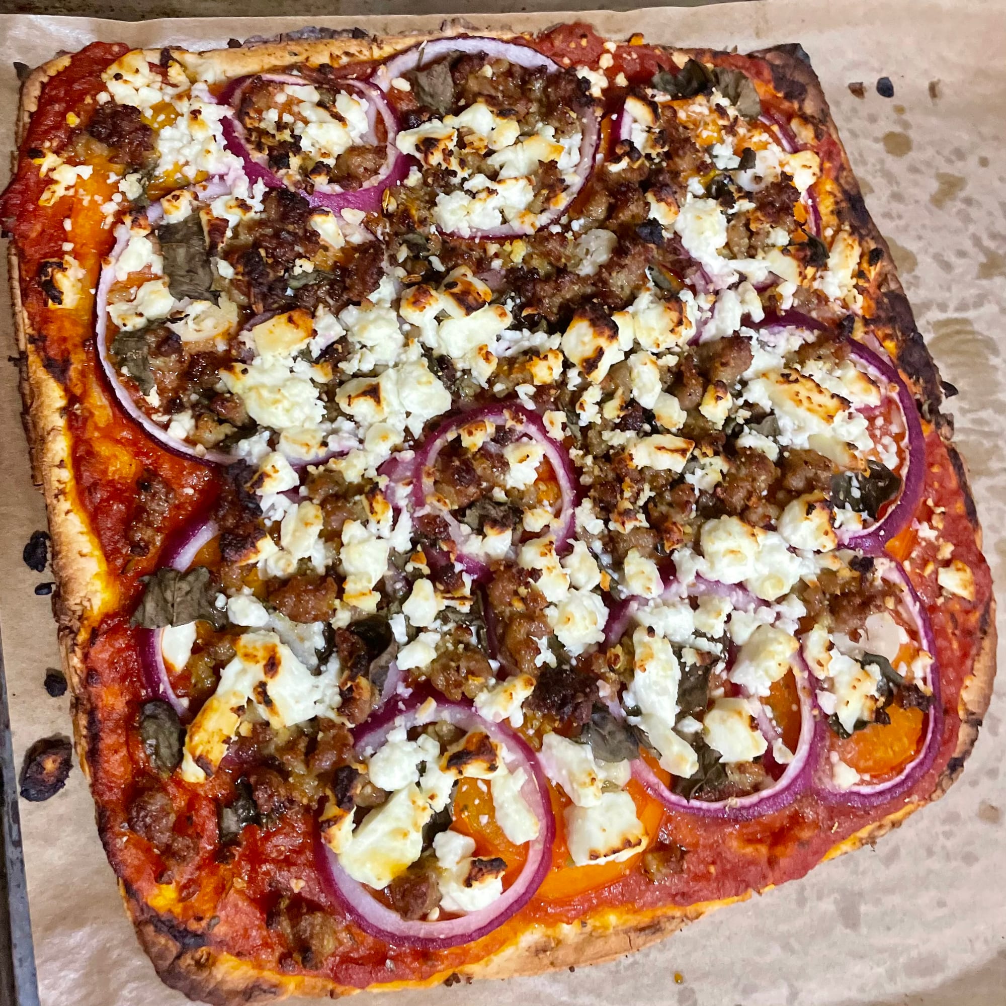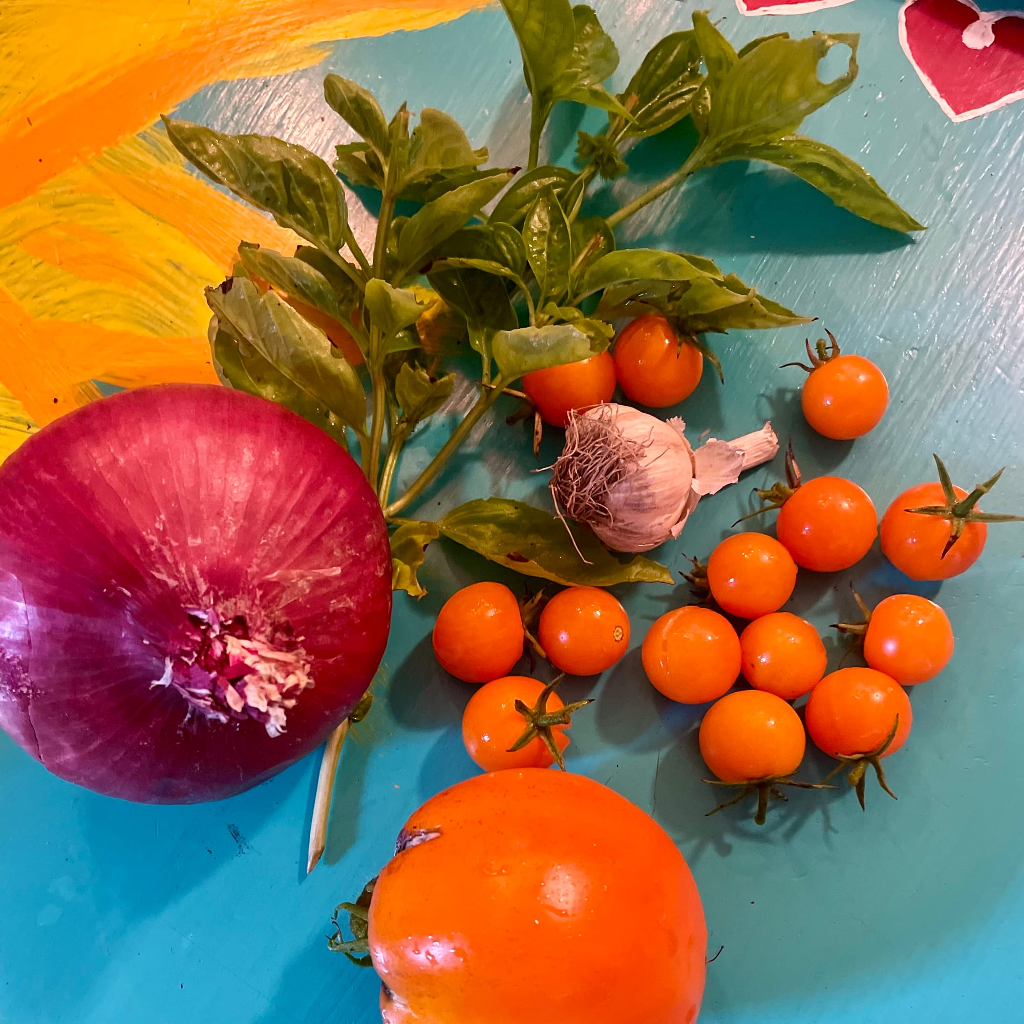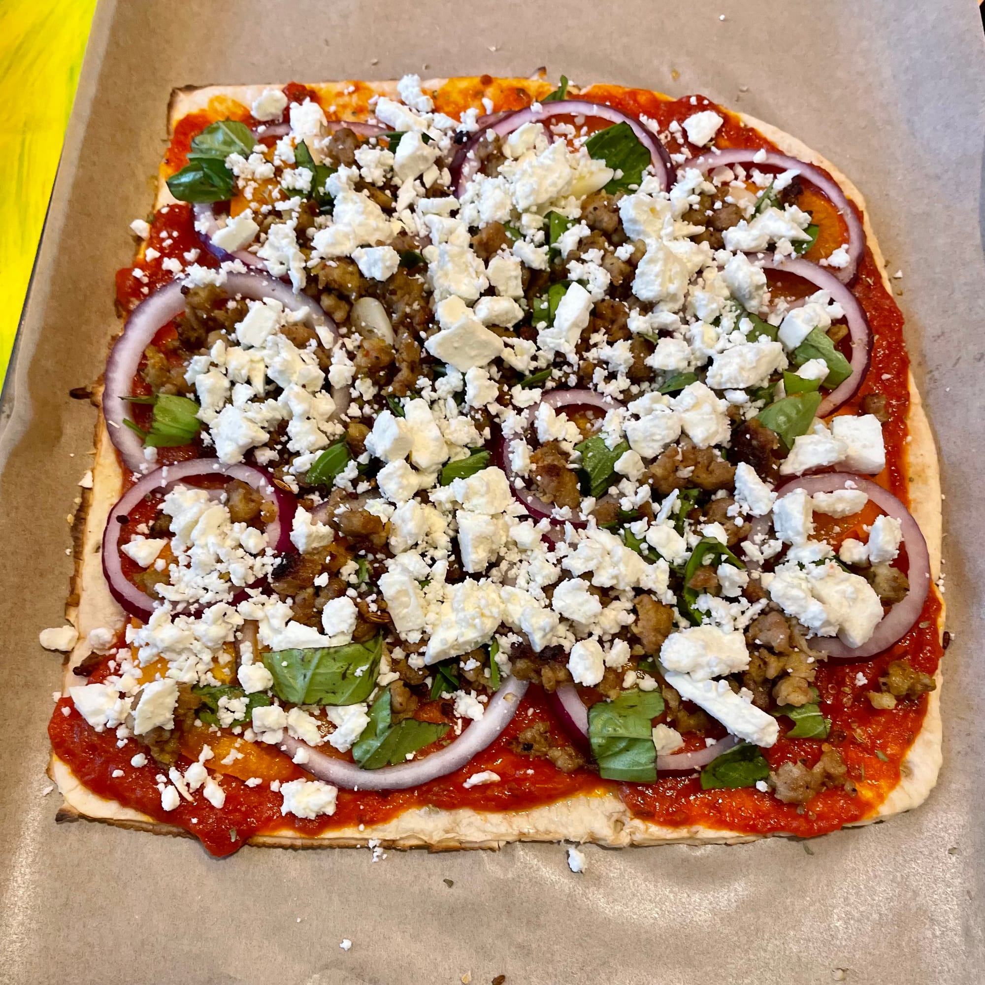Tonight we did a flatbread featuring heirloom tomatoes, basil, feta, garlic (onions & sausage;) drizzled with a balsamic glaze… Heirloom tomatoes offer many beneficial nutrients. Containing high amounts of vitamin C, an antioxidant that supports immune function. They also offer Vitamin A for vision and skin health, and Vitamin K for blood clotting. Vibrant colors indicate various antioxidants and phytonutrients. Orange varieties, for example, are rich in lycopene and beta-carotene, powerful antioxidants that protect cells from damage.